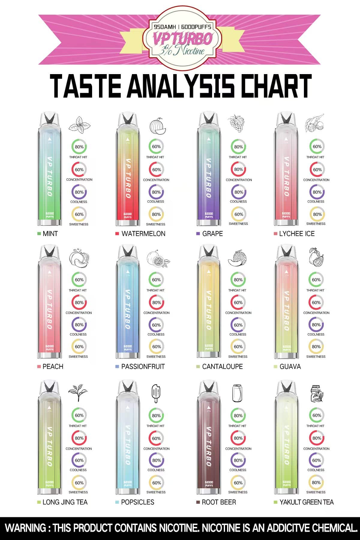 VP Turbo 6000 提供多款口味選擇,方便隨身攜帶,適合追求便利與持久口感的成年人使用。購買時請認準官方渠道,未成年人禁止使用。